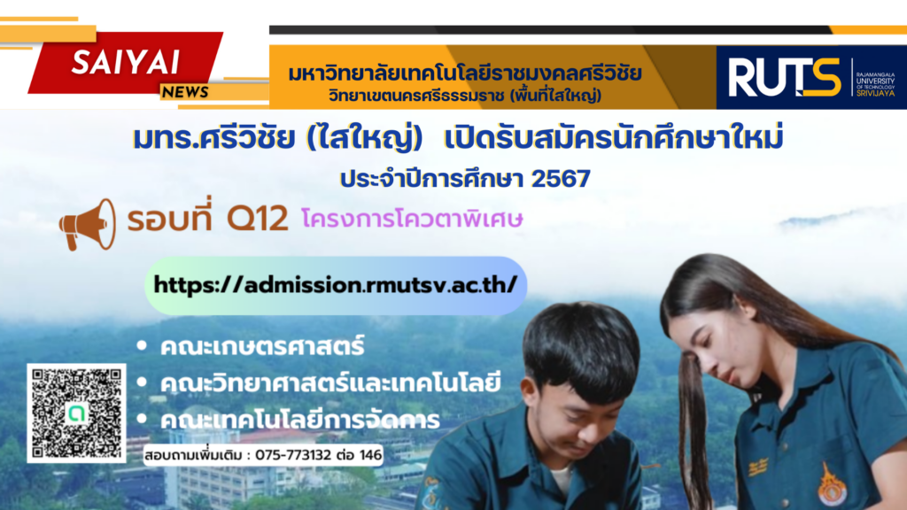มหาวิทยาลัยเทคโนโลยีราชมงคลศรีวิชัย วิทยาเขตนครศรีธรรมราช ไสใหญ่ เปิดรับสมัครนักศึกษาใหม่ ประจำปีการศึกษา 2567 รอบที่ Q12 โครงการโควตาพิเศษ