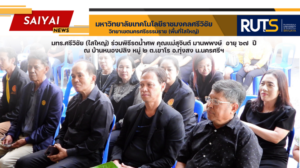 วันที่ ๔ มีนาคม ๒๕๖๗ ผู้ช่วยศาสตราจารย์วิทยากร ฤทธิมนตรี ผู้อำนวยการสำนักงานวิทยาเขตนครศรีธรรมราช พร้อมด้วย คณะผู้บริหาร คณาจารย์ บุคลากรมหาวิทยาลัยเทคโนโลยีราชมงคลศรีวิชัย วิทยาเขตนครศรีธรรมราช (ไสใหญ่) ร่วมพิธีรดน้ำศพคุณแม่สุจินต์ มานพพงษ์ อายุ ๖๗ ปี ถึงแก่กรรมมารดาของ นางสาวจีรภา มานพพงษ์ บุคลากรสังกัด แผนกทะเบียนและวัดผล งานบริการการศึกษา สำนักงานวิทยาเขตนครศรีธรรมราช มทร.ศรีวิชัย (ไสใหญ่) ณ บ้านหนองปลิง หมู่ ๒ ต.เขาโร อ.ทุ่งสง จ.นครศรีฯ