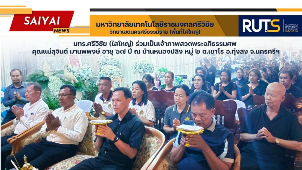 ผู้ช่วยศาสตราจารย์วิทยากร ฤทธิมนตรี ผู้อำนวยการสำนักงานวิทยาเขตนครศรีธรรมราช พร้อมด้วย คณะผู้บริหาร คณาจารย์ บุคลากรมหาวิทยาลัยเทคโนโลยีราชมงคลศรีวิชัย วิทยาเขตนครศรีธรรมราช (ไสใหญ่) ร่วมพิธีสวดพระอภิธรรมศพ คุณแม่สุจินต์ มานพพงษ์ อายุ ๖๗ ปี ถึงแก่กรรมมารดาของ นางสาวจีรภา มานพพงษ์ บุคลากรสังกัด แผนกทะเบียนและวัดผล งานบริการการศึกษา สำนักงานวิทยาเขตนครศรีธรรมราช มทร.ศรีวิชัย (ไสใหญ่) ณ บ้านหนองปลิง หมู่ ๒ ต.เขาโร อ.ทุ่งสง จ.นครศรีฯ