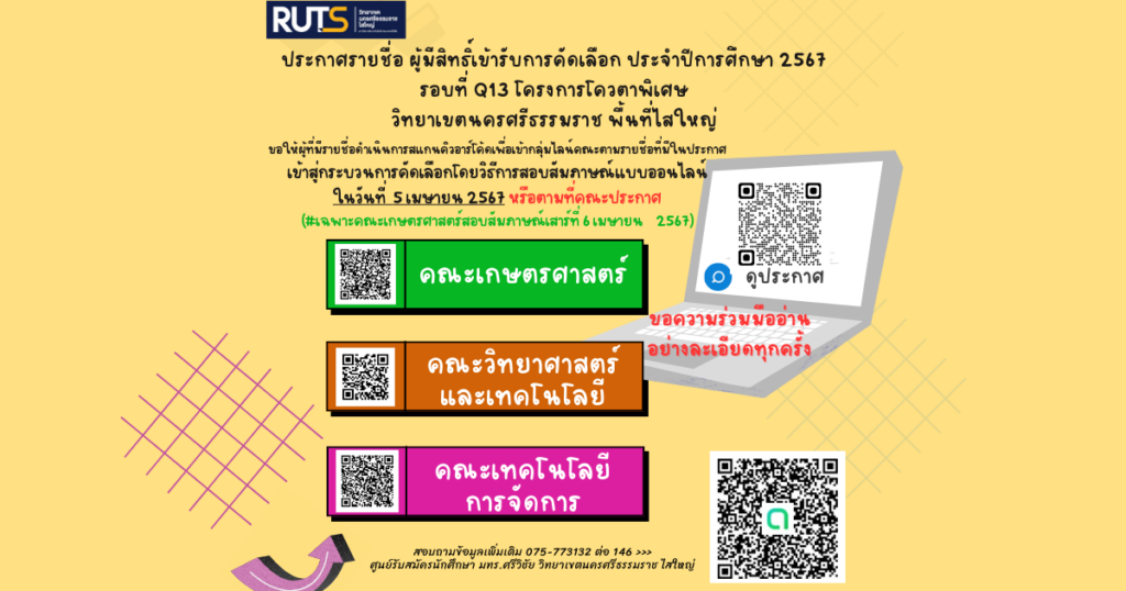 ประกาศรายชื่อผู้มีสิทธิ์เข้ารับการคัดเลือก ประจำปีการศึกษา 2567 รอบที่ Q13 โครงการโควตาพิเศษ วิทยาเขตนครศรีธรรมราช พื้นที่ไสใหญ่