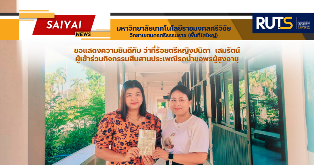 ขอแสดงความยินดีกับผู้เข้าร่วมกิจกรรมสืบสานประเพณีรดน้ำขอพรผู้สูงอายุ ในวันพุธที่ 10 เมษายน 2567 ณ อาคารหอประชุมวิธานสันติ มหาวิทยาลัยเทคโนโลยีราชมงคลศรีวิชัย วิทยาเขตนครศรีธรรมราช พื้นที่ไสใหญ่ และร่วมตอบแบบประเมินความพึงพอใจพร้อมลุ้นรับของที่ระลึก