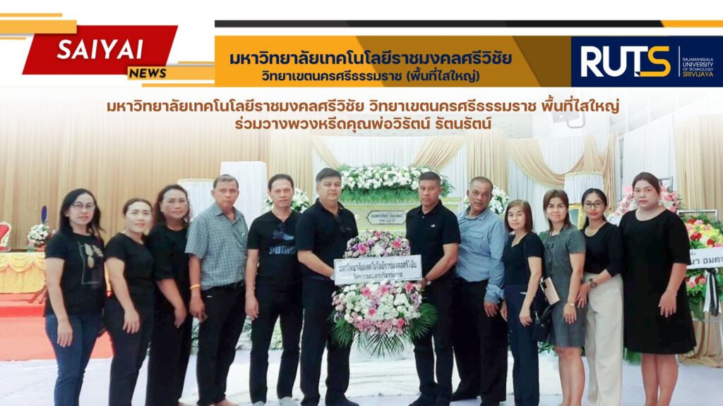 วันที่ 6 พฤษภาคม 2567 ผู้ช่วยศาสตราจารย์ ดร.สมคิด ชัยเพชร รองอธิการบดีประจำวิทยาเขตนครศรีธรรมราช พร้อมด้วย ผู้ช่วยศาสตราจารย์ วิทยากร ฤทธิมนตรี ผู้อำนวยการสำนักงานวิทยาเขตนครศรีธรรมราช คณะผู้บริหาร และบุคลากร มหาวิทยาลัยเทคโนโลยีราชมงคลศรีวิชัย วิทยาเขตนครศรีธรรมราช พื้นที่ไสใหญ่ ร่วมวางพวงหรีดคุณพ่อวิรัตน์ รัตนรัตน์