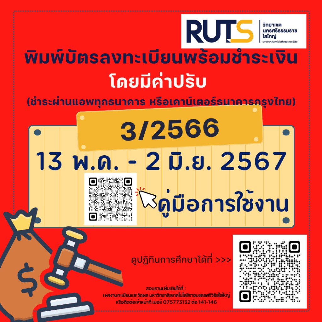 กรณีมีปัญหา ไม่สามารถชำระเงินได้ ติดต่อสอบถามเพิ่มเติมได้ที่ กลุ่มไลน์ “แจ้งเตือนและข่าวสาร ทะเบียนและวัดผล&ส่งเสริมฯ RUTSไสใหญ่” โปรดแตะลิงก์ด้านล่างเพื่อเข้าร่วมโอเพนแชทนี้