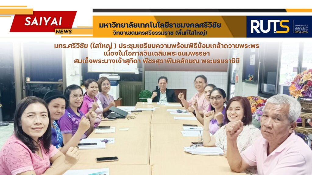 วันที่ 21 พฤษภาคม 2567 ผู้ช่วยศาสตราจารย์วิทยากร ฤทธิมนตรี ผู้อำนวยการสำนักงานวิทยาเขตนครศรีธรรมราช พร้อมด้วย คณะผู้บริหาร คณาจารย์ บุคลากร มหาวิทยาลัยเทคโนโลยีราชมงคลศรีวิชัย วิทยาเขตนครศรีธรรมราช (ไสใหญ่) ร่วมประชุมเตรียมความพร้อมพิธีน้อมเกล้าถวายพระพรเนื่องในโอกาสวันเฉลิมพระชนมพรรษา สมเด็จพระนางเจ้าสุทิดา พัชรสุธาพิมลลักษณ พระบรมราชินี ณ ห้องประชุมฝ่ายกิจการนักศึกษา มหาวิทยาลัยเทคโนโลยีราชมงคลศรีวิชัย วิทยาเขตนครศรีธรรมราช (ไสใหญ่)
