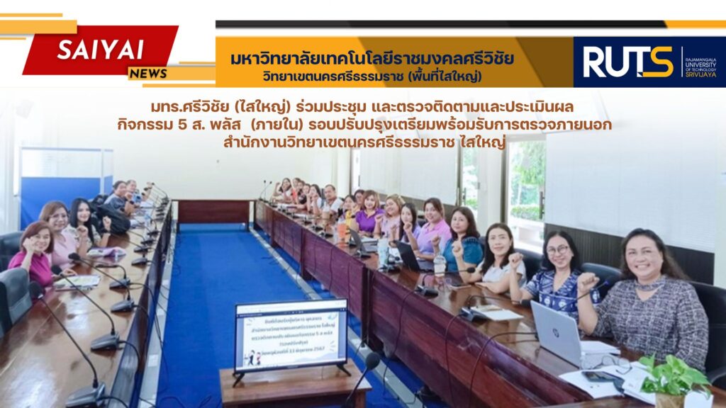 วันที่ 13 มิถุนายน 2567 นางรัตนา หยงสตาร์ พร้อมด้วย คณะผู้บริหาร บุคลากร มหาวิทยาลัยเทคโนโลยีราชมงคลศรีวิชัย วิทยาเขตนครศรีธรรมราช พื้นที่ไสใหญ่ ร่วมประชุม และตรวจติดตามและประเมินผลกิจกรรม 5 ส. พลัส (ภายใน) รอบปรับปรุงเตรียมพร้อมรับการตรวจภายนอก สำนักงานวิทยาเขตนครศรีธรรมราช ไสใหญ่