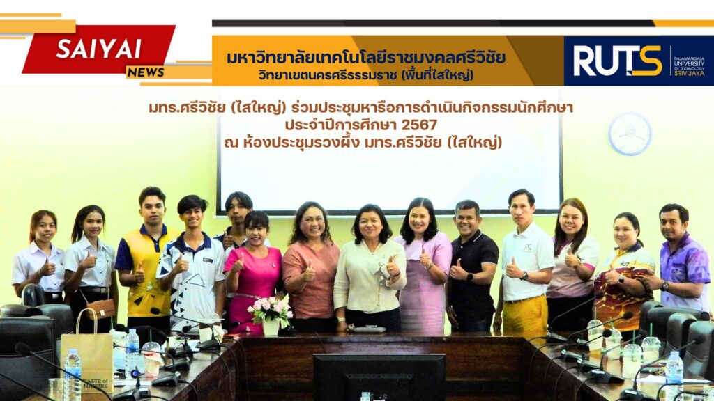 วันที่ 18 มิถุนายน 2567 ผู้ช่วยศาสตราจารย์ ดร.ขวัญหทัย ใจเปี่ยม รองอธิการบดีประจำวิทยาเขตนครศรีธรรมราช ให้เกียรติเป็นประธาน การประชุมหารือการดำเนินกิจกรรมนักศึกษา ประจำปีการศึกษา 2567 พร้อมด้วยคณะผู้บริหาร บุคลากร และผู้นำนักศึกษา มหาวิทยาลัยเทคโนโลยีราชมงคลศรีวิชัย วิทยาเขตนครศรีธรรมราช (ไสใหญ่) ร่วมประชุม ณ ห้องประชุมรวงผึ้งมหาวิทยาลัยเทคโนโลยีราชมงคลศรีวิชัย วิทยาเขตนครศรีธรรมราช (ไสใหญ่)