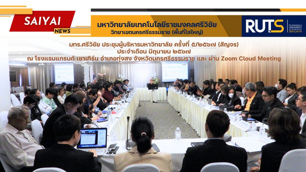 วันที่ 19 มิถุนายน 2567 ศาสตราจารย์ ดร.สุวัจน์ ธัญรส อธิการบดีมหาวิทยาลัยเทคโนโลยีราชมงคลศรีวิชัย เป็นประธานการประชุมผู้บริหารมหาวิทยาลัย ครั้งที่ 5/2567 (สัญจร) ประจำเดือน มิถุนายน 2567 เพื่อร่วมพัฒนาขับเคลื่อนการพัฒนามหาวิทยาลัยฯสู่ความสำเร็จ ณ โรงแรมแกรนด์ เซาเทิร์น อำเภอทุ่งสง จังหวัดนครศรีธรรมราช และ ผ่าน Zoom Cloud Meeting