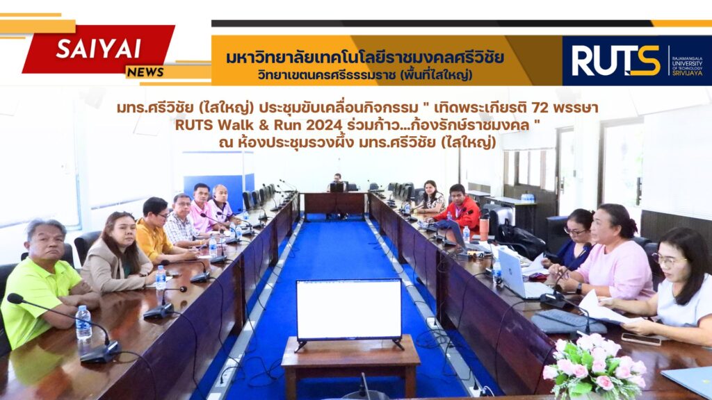 วันที่ 25 มิถุนายน 2567 ผู้ช่วยศาสตราจารย์ ดร.ขวัญหทัย ใจเปี่ยม รองอธิการบดีประจำวิทยาเขตนครศรีธรรมราช มอบหมายให้ นางรัตนา หยงสตาร์ หัวหน้างานบริการการศึกษา ดำเนินการประชุมขับเคลื่อน กิจกรรม ” เทิดพระเกียรติ 72 พรรษา RUTS Walk & Run 2024 ร่วมก้าว…ก้องรักษ์ราชมงคล ” ณ ห้องประชุมรวงผึ้ง มหาวิทยาลัยเทคโนโลยีราชมงคลศรีวิชัย วิทยาเขตนครศรีธรรมราช (ไสใหญ่)
