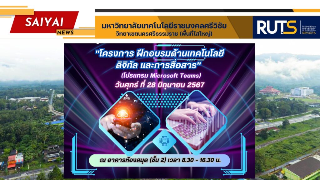 ขอเชิญเข้าร่วม “โครงการฝึกอบรมด้านเทคโนโลยีดิจิทัล และการสื่อสาร” (โปรแกรม Microsoft Teams) วันศุกร์ที่ 28 มิถุนายน 2567 ณ อาคารห้องสมุด ชั้น 2 เวลา 8.30 – 16.30 น.