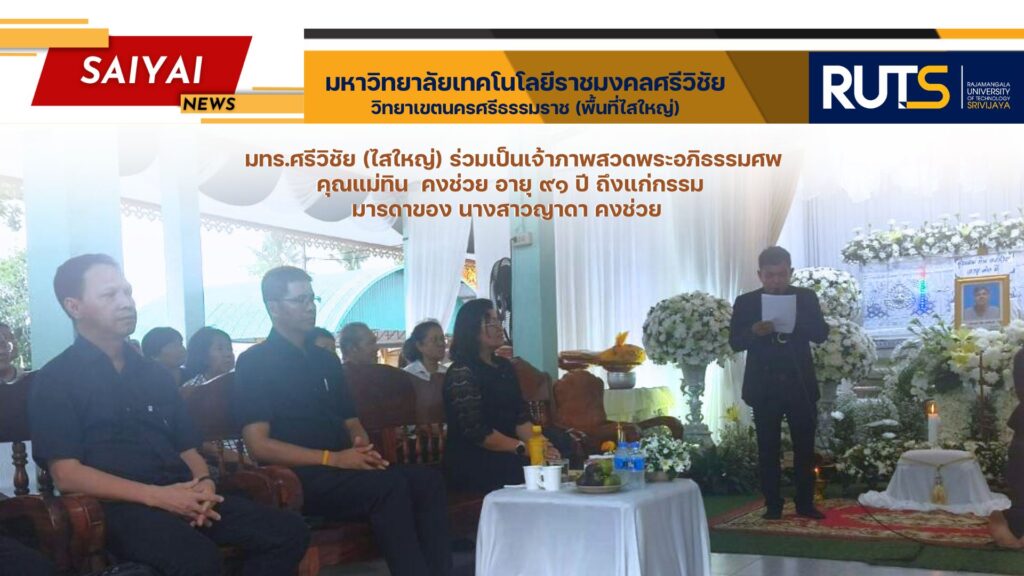 วันที่ 28 มิถุนายน 2567 ผู้ช่วยศาสตราจารย์ ดร.ขวัญหทัย ใจเปี่ยม รองอธิการบดีประจำวิทยาเขตนครศรีธรรมราช พร้อมด้วย ผู้ช่วยศาสตราจารย์ วิทยากร ฤทธิมนตรี ผู้อำนวยการสำนักงานวิทยาเขตนครศรีธรรมราช คณะผู้บริหาร และบุคลากร มหาวิทยาลัยเทคโนโลยีราชมงคลศรีวิชัย วิทยาเขตนครศรีธรรมราช พื้นที่ไสใหญ่ เข้าร่วมเป็นเจ้าภาพสวดพระอภิธรรมศพ คุณแม่ทิน คงช่วย อายุ 91 ปี ถึงแก่กรรม มารดาของ นางสาวญาดา คงช่วย ณ วัดทุ่งนุ้ย ต.ทุ่งนุ้ย อ.ควนกาหลง จ.สตูล