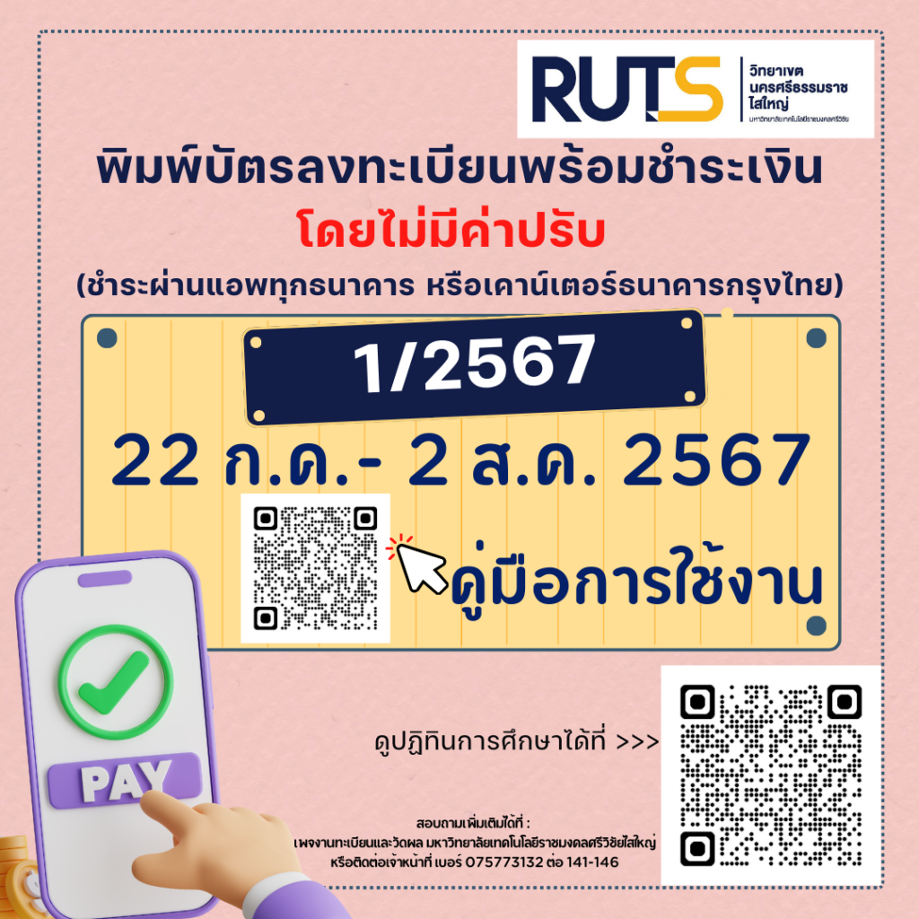 หลังจากชำระเงินให้เก็บหลักฐานให้ดีห้ามหาย และรอปรับสถานะไม่เกิน 7 วันทำการ หากเกินระยะเวลาที่กำหนด สามารถติดต่อ แผนกการเงินเพื่อสอบถามข้อมูลเพิ่มเติม ได้ที่ 075-773131 ต่อหมายเลขภายใน 123