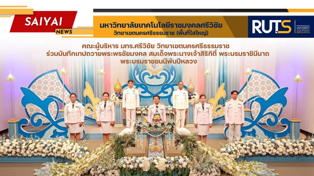 วันที่ 30 กรกฎาคม 2567 ผู้ช่วยศาสตราจารย์ ดร.ขวัญหทัย ใจเปี่ยม รองอธิการบดีประจำวิทยาเขตนครศรีธรรมราช พร้อมด้วยคณะผู้บริหาร และบุคลากร มหาวิทยาลัยเทคโนโลยีราชมงคลศรีวิชัย วิทยาเขตนครศรีธรรมราช ร่วมบันทึกเทปถวายพระพรชัยมงคล สมเด็จพระนางเจ้าสิริกิติ์ พระบรมราชินีนาถ พระบรมราชชนนีพันปีหลวง ณ สถานีโทรทัศน์ NBT นครศรีธรรมราช จังหวัดนครศรีธรรมราช
