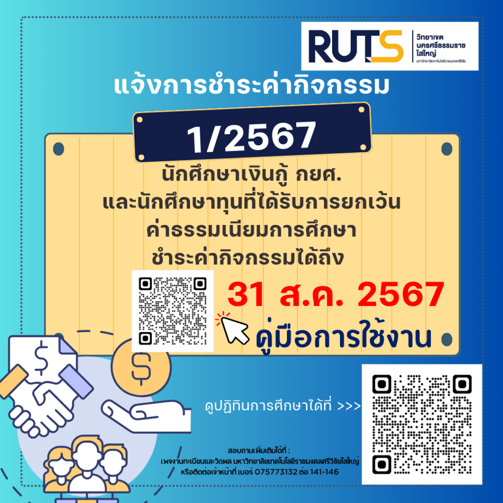 แจ้งนักศึกษาเงินกู้ กยศ. และนักศึกษาทุนที่ได้รับการยกเว้น ค่าธรรมเนียมการศึกษา ชำระค่ากิจกรรม ประจำภาคการศึกษาที่ 1 ปีการศึกษา 2567 ผ่านระบบ https://sis.rmutsv.ac.th/ ให้แล้วเสร็จภายในวันที่ 6 สิงหาคม 2567