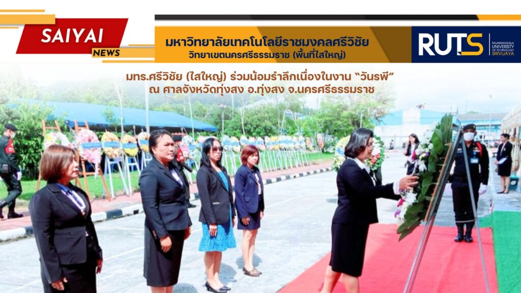 วันที่ 7 สิงหาคม 2567 ผู้ช่วยศาสตราจารย์ ดร.ขวัญหทัย ใจเปี่ยม รองอธิการบดีประจำวิทยาเขตนครศรีธรรมราช พร้อมด้วยคณะผู้บริหาร และบุคลากร มหาวิทยาลัยเทคโนโลยีราชมงคลศรีวิชัย วิทยาเขตนครศรีธรรมราช พื้นที่ไสใหญ่ ร่วมน้อมรำลึกเนื่องในงาน “วันรพี” ณ ศาลจังหวัดทุ่งสง อ.ทุ่งสง จ.นครศรีธรรมราช