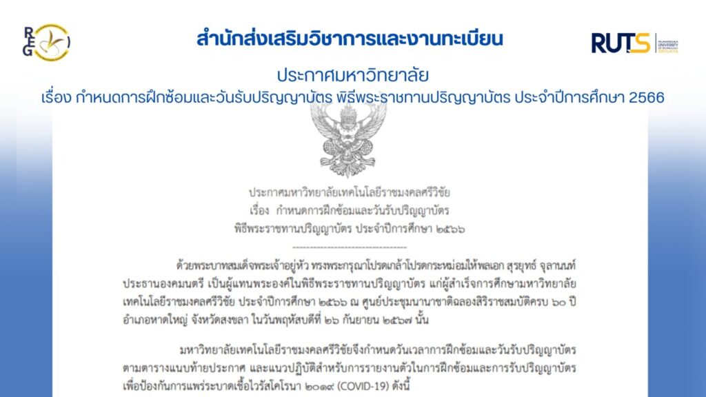 กำหนดการฝึกซ้อมและวันรับปริญญาบัตร พิธีพระราชทานปริญญาบัตร ประจำปีการศึกษา 2566 ดูรายละเอียดเพิ่มเติมได้ที่ https://reg.rmutsv.ac.th/ruts/2024/08/27/4745/graduationschedule66