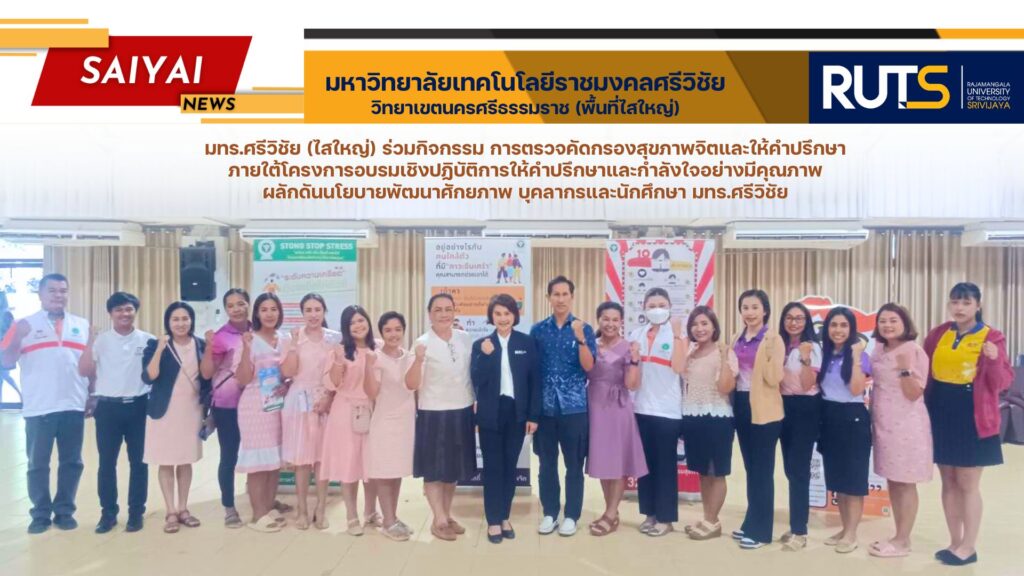 วันที่ 3 กันยายน 2567 ผู้ช่วยศาสตราจารย์ปิยะ ประสงค์จันทร์ รองอธิการบดีมหาวิทยาลัยเทคโนโลยีราชมงคลศรีวิชัย มอบหมายให้ นางดาวดล สวัสดิลานนท์ ผู้อำนวยการกองพัฒนานักศึกษา และนายซัมพูเด็ง มีนา นักสุขศึกษา กองพัฒนานักศึกษา มหาวิทยาลัยเทคโนโลยีราชมงคลศรีวิชัย จัดกิจกรรม การตรวจคัดกรองสุขภาพจิตและให้คำปรึกษา ภายใต้โครงการอบรมเชิงปฏิบัติการให้คำปรึกษาและกำลังใจอย่างมีคุณภาพ โดย ผู้ช่วยศาสตราจารย์ ดร.ขวัญหทัย ใจเปี่ยม รองอธิการบดีประจำวิทยาเขตนครศรีธรรมราช เชิญชวนให้คณะผู้บริหาร บุคลากร และนักศึกษา ร่วมตรวจคัดกรองสุขภาพจิตและให้คำปรึกษา เพื่อพัฒนาศักยภาพบุคลากรและนักศึกษา ณ ห้องประชุมวิธานสันติ มหาวิทยาลัยเทคโนโลยีราชมงคลศรีวิชัย วิทยาเขตนครศรีธรรมราช (ไสใหญ่)
