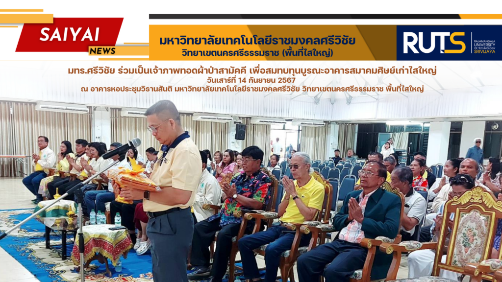 วันที่ 14 กันยายน 2567 ศาสตราจารย์ ดร. สุวัจน์ ธัญรส อธิการบดี มหาวิทยาลัยเทคโนโลยีราชมงคลศรีวิชัย ให้เกียรติเป็นประธานทอดผ้าป่าสามัคคี พร้อมด้วยคณะผู้บริหาร และบุคลากร รวมถึงสมาคมศิษย์เก่าไสใหญ่ ศิษย์เก่าไสใหญ่ และบุคคลที่สนใจ ร่วมเป็นเจ้าภาพทอดผ้าป่าสามัคคี เพื่อสมทบทุนบูรณะอาคารสมาคมศิษย์เก่าไสใหญ่ ณ หอประชุมวิธานสันติ มหาวิทยาลัยเทคโนโลยีราชมงคลศรีวิชัย วิทยาเขตนครศรีธรรมราช (พื้นที่ใสใหญ่)