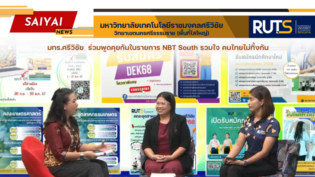 วันที่ 15 ตุลาคม 2567 ผู้ช่วยศาสตราจารย์ ดร. อวยพร วงศ์กูล รักษาราชการแทนผู้อำนวยการ สำนักงานวิทยาเขตนครศรีธรรมราช พร้อมด้วย บุคลากร พื้นที่ไสใหญ่ พื้นที่ทุ่งใหญ่ และบุคลากร คณะเกษตรศาสตร์ คณะเทคโนโลยีการจัดการ ร่วมพูดคุยกันในรายการ NBT South รวมใจ คนไทยไม่ทิ้งกัน 15.00 น. ประเด็น“มทร.ศรีวิชัย มหาวิทยาลัยแห่ง โอกาส เพื่อการพัฒนาประเทศให้มั่งคั่ง” พร้อมทั้งประชาสัมพันธ์การรับสมัครนักศึกษาใหม่ประจำปีการศึกษา 2568