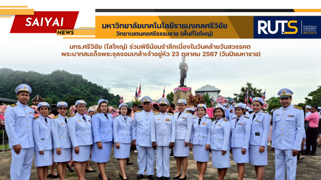 วันที่ 23 ตุลาคม 2567 อาจารย์สมชาย เรืองสว่าง ผู้ช่วยอธิการบดี ประจำวิทยาเขตนครศรีธรรมราช พร้อมด้วย คณะผู้บริหาร บุคลากร และนักศึกษา มหาวิทยาลัยเทคโนโลยีราชมงคลศรีวิชัย วิทยาเขตนครศรีธรรมราช ร่วมวางพวงมาลาแลร่วมพิธีน้อมรำลึกเนื่องในวันคล้ายวันสวรรคต พระบาทสมเด็จพระจุลจอมเกล้าเจ้าอยู่หัว 23 ตุลาคม 2567 (วันปิยมหาราช) ณ ลานพระบรมราชานุสาวรีย์ พระบาทสมเด็จพระจุลจอมเกล้าเจ้าอยู่หัว (รัชกาลที่ 5) สวนสาธารณะเฉลิมพระเกียรติ 6 รอบ พระชมพรรษา เทศบาลเมืองทุ่งสง อำเภอทุ่งสง จังหวัดนครศรีธรรมราช เพื่อแสดงความจงรักภักดี และน้อมรำลึกถึงพระมหากรุณาธิคุณ ที่ทรงปฏิบัติพระราชกรณียกิจเพื่อประโยชน์สุขแก่ปวงชนชาวไทยตลอดมา