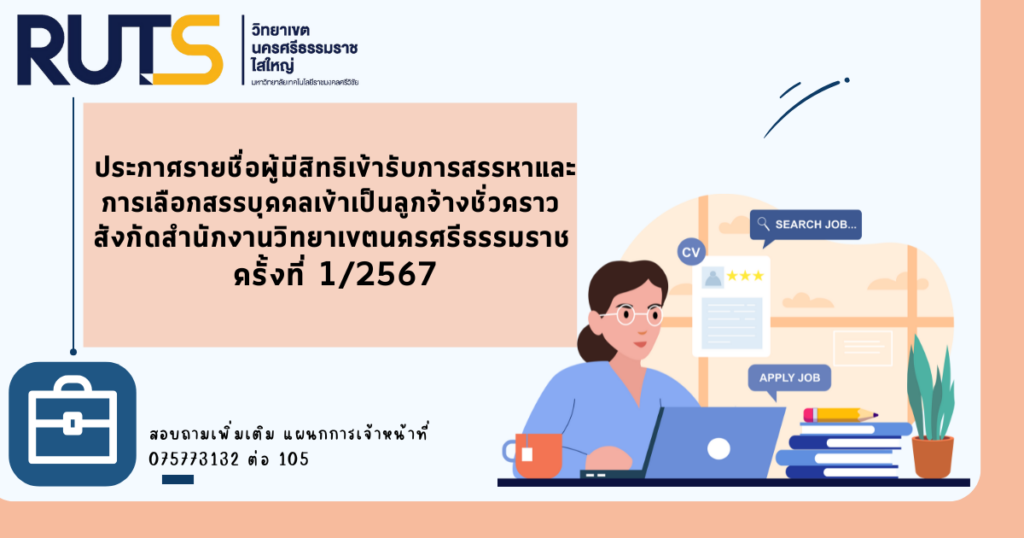 ประกาศรายชื่อผู้มีสิทธิเข้ารับการสรรหาและการเลือกสรรบุคคลเข้าเป็นลูกจ้างชั่วคราว สังกัดสำนักงานวิทยาเขตนครศรีธรรมราช ครั้งที่ 1/2567