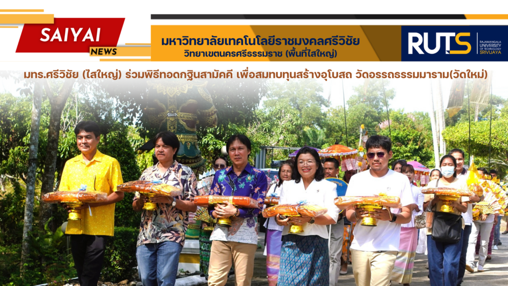 วันที่ 2 พฤศจิกายน พ.ศ. 2567 ผู้ช่วยศาสตราจารย์ ดร.ขวัญหทัย ใจเปี่ยม รองอธิการบดีประจำวิทยาเขตนครศรีธรรมราช พร้อมด้วยคณะผู้บริหาร บุคลากร และนักศึกษา มหาวิทยาลัยเทคโนโลยีราชมงคลศรีวิชัย วิทยาเขตนครศรีธรรมราช (ไสใหญ่) เข้าร่วมพิธีทอดกฐินสามัคคี เพื่อสมทบทุนสร้างอุโบสถ วัดอรรถธรรมมาราม(วัดใหม่) อ.ร่อนพิบูลย์ จ.นครศรีธรรมราช