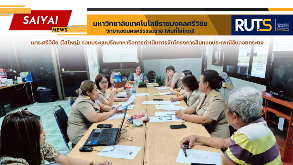 วันที่ 6 พฤศจิกายน 2567 นางสาวจีรภา มานพพงษ์ หัวหน้างานบริการการศึกษา ให้เกียรติเป็นประธานการประชุมปรึกษาหารือการดำเนินการจัดโครงการสืบทอดประเพณีวันลอยกระทง ณ ห้องประชุมแผนกกิจการนักศึกษา มหาวิทยาลัยเทคโนโลยีราชมงคลศรีวิชัย วิทยาเขตนครศรีธรรมราช (พื้นที่ไสใหญ่)