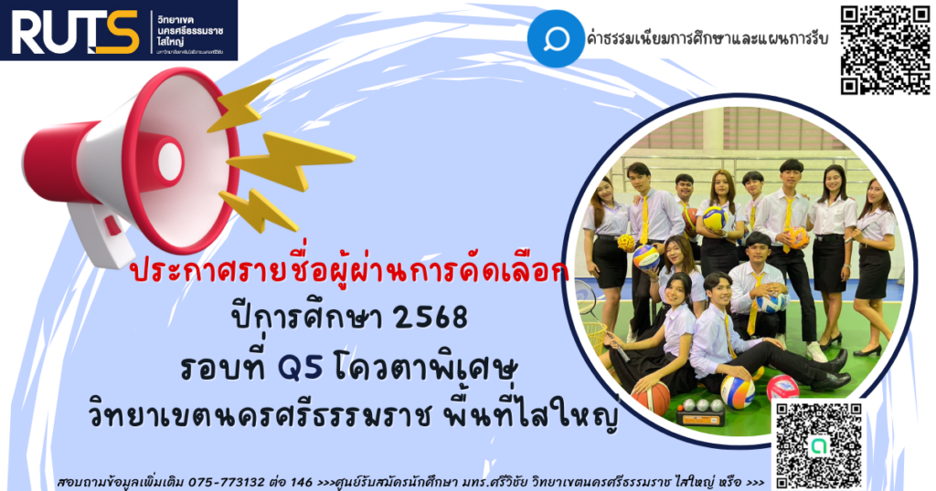 ประกาศรายชื่อผู้ผ่านการคัดเลือก ปีการศึกษา 2568 รอบที่ Q5 โควตาพิเศษ วิทยาเขตนครศรีธรรมราช พื้นที่ไสใหญ่ โดยผู้ผ่านการคัดเลือกดำเนินการตามขั้นตอน และดูประกาศได้จากลิงค์ดาวน์โหลดด้านล่าง