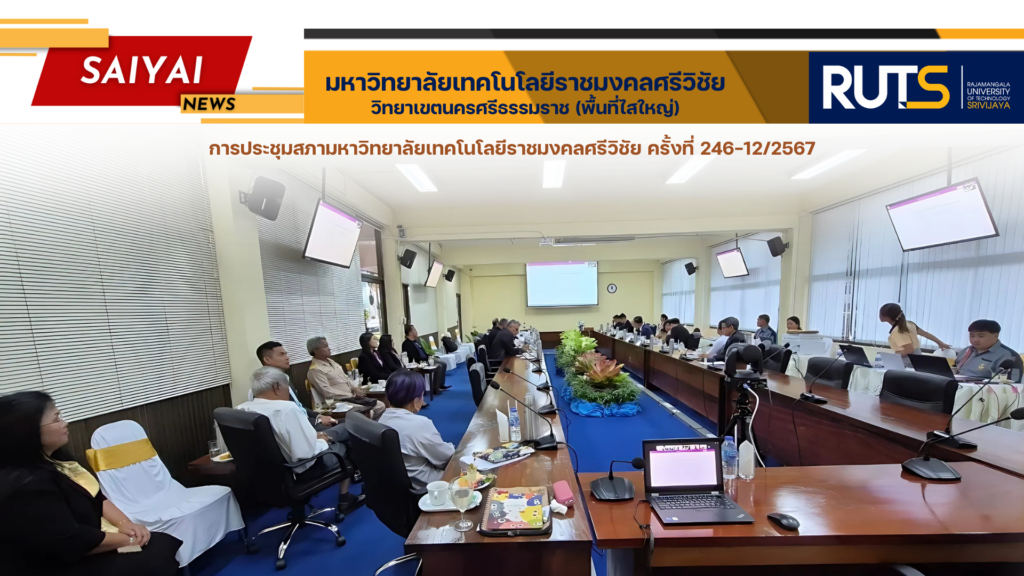 วันที่ 20 พฤศจิกายน 2567 สำนักงานสภามหาวิทยาลัยฯ ได้จัดประชุมสภามหาวิทยาลัยเทคโนโลยีราชมงคลศรีวิชัย ครั้งที่ 246-12/2567 ณ ห้องประชุมรวงผึ้ง สำนักงานวิทยาเขตนครศรีธรรมราช พื้นที่ไสใหญ่ และการประชุมผ่านสื่ออิเล็กทรอนิกส์ (Zoom Clound Meetings) โดยมีคณะกรรมการสภามหาวิทยาลัยฯ และผู้ร่วมสังเกตการณ์การประชุมสภามหาวิทยาลัยฯ เข้าร่วมการประชุมในครั้งนี้