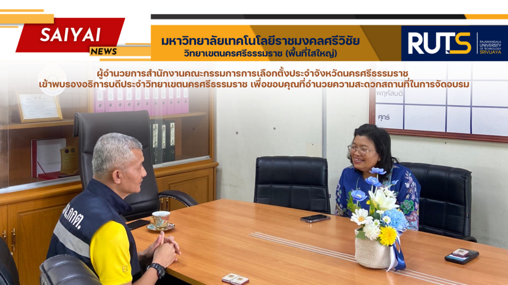 เมื่อวันที่ 22 พฤศจิกายน 2567 นายธนกฤต นาคจารุพงษ์ ผู้อำนวยการสำนักงานคณะกรรมการการเลือกตั้งประจำจังหวัดนครศรีธรรมราช เข้าพบผู้ช่วยศาสตราจารย์ ดร.ขวัญหทัย ใจเปี่ยม รองอธิการบดีประจำวิทยาเขตนครศรีธรรมราช เพื่อขอบคุณที่อำนวยความสะดวกสถานที่เพื่ออบรม กรรมการการเลือกตั้งและเจ้าหน้าที่รักษาความปลอดภัยประจำหน่วยเลือกตั้ง การเลือกตั้งนายก อบจ. นครศรีธรรมราช