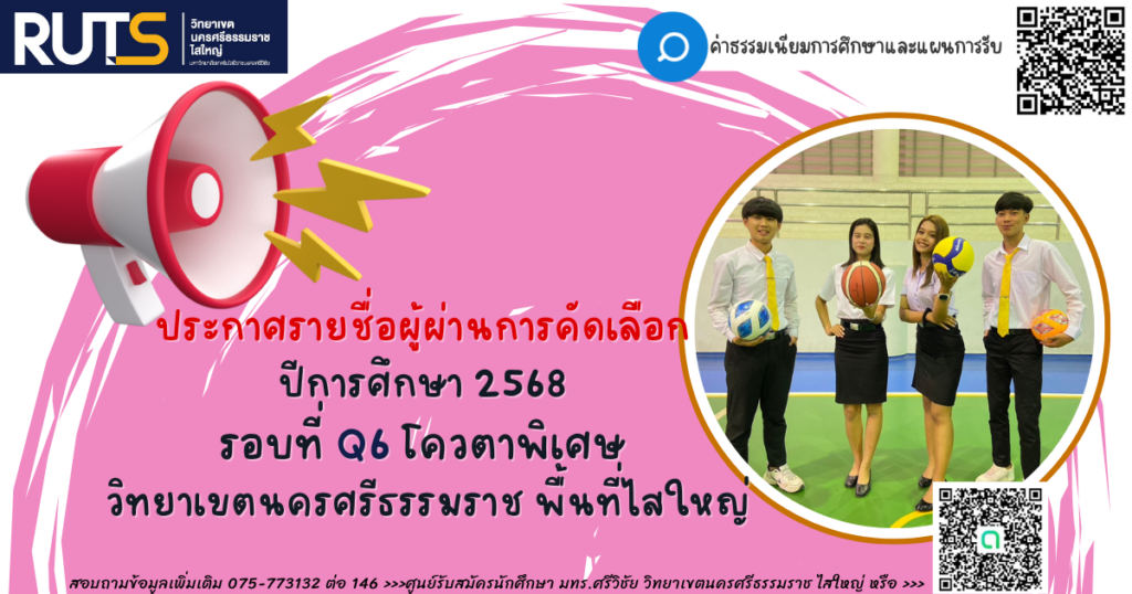 ประกาศรายชื่อผู้ผ่านการคัดเลือก ปีการศึกษา 2568 รอบที่ Q6 โควตาพิเศษ วิทยาเขตนครศรีธรรมราช พื้นที่ไสใหญ่ โดยผู้ผ่านการคัดเลือกดำเนินการตามขั้นตอน และดูประกาศได้จากลิงค์ดาวน์โหลดด้านล่าง