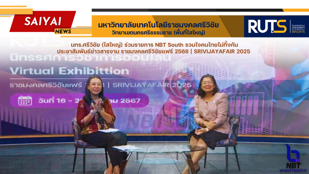 วันที่ 26 พฤศจิกายน 2567 ผู้ช่วยศาสตราจารย์ ดร.ขวัญหทัย ใจเปี่ยม รองอธิการบดีประจำวิทยาเขตนครศรีธรรมราช พร้อมด้วยบุคลากร เข้าร่วมรายการ NBT South รวมใจคนไทยไม่ทิ้งกัน ประชาสัมพันธ์ข่าวสารงาน ราชมงคลศรีวิชัยแฟร์ 2568 | SRIVIJAYAFAIR 2025 ซึ่งจะมีการจัดขึ้นในระหว่างวันที่ 16 – 20 ธันวาคม 2567 ในรูปแบบ Virtual Exhibition Platform และนิทรรศการวิชาการ ราชมงคลศรีวิชัยแฟร์ 2025 ในแต่ละพื้นที่ เป็นการประชาสัมพันธ์การจัดการเรียนการสอน การแสดงความโดดเด่นที่เป็นอัตลักษณ์ของแต่ละหลักสูตร เป็นเวทีแลกเปลี่ยนเรียนรู้ผลงานทางวิชาการของคณาจารย์ และนักศึกษา ส่งเสริมให้นักศึกษาพัฒนาทักษะปฏิบัติ