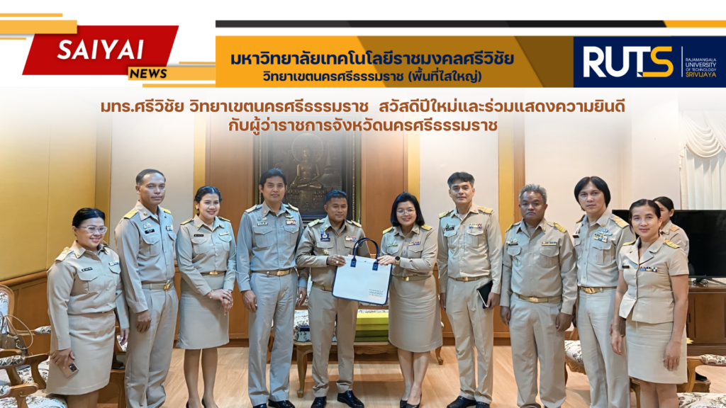 วันที่ 6 มกราคม 2568 ผู้ช่วยศาสตราจารย์ ดร.ขวัญหทัย ใจเปี่ยม รองอธิการบดีประจำวิทยาเขตนครศรีธรรมราช พร้อมด้วยคณะผู้บริหารและบุคลากร มหาวิทยาลัยเทคโนโลยีราชมงคลศรีวิชัย วิทยาเขตนครศรีธรรมราช ร่วมสวัสดีปีใหม่และร่วมแสดงความยินดีกับคุณสมชาย ลีหล้าน้อย ผู้ว่าราชการจังหวัดนครศรีธรรมราช ณ ศาลากลางจังหวัดนครศรีธรรมราช