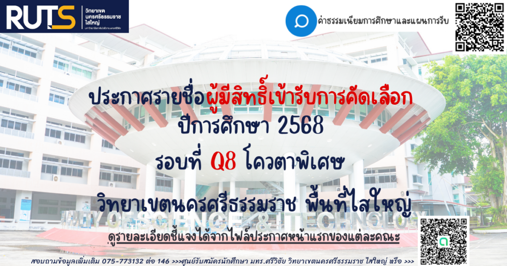 ประกาศรายชื่อ ผู้มีสิทธิ์เข้ารับการคัดเลือก ปีการศึกษา 2568 รอบที่ Q8 โควตาพิเศษ วิทยาเขตนครศรีธรรมราช พื้นที่ไสใหญ่เข้าสู่กระบวนการคัดเลือก โดยวิธีการสอบสัมภาษณ์แบบออนไลน์ ในวันที่ 10 มกราคม 2568 ให้นักศึกษาดูประกาศของคณะที่สมัคร ที่เอกสารแนบด้านล่าง อย่างละเอียด!
