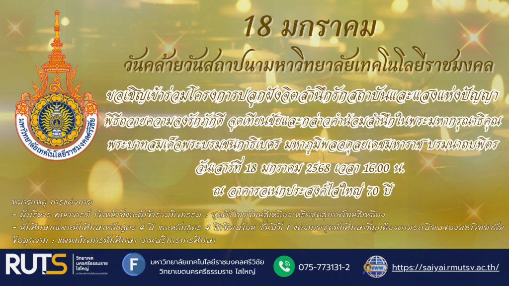 เนื่องในวันคล้ายวันสถาปนามหาวิทยาลัยเทคโนโลยีราชมงคล ขอเชิญเข้าร่วมโครงการปลูกฝังจิตสำนึกรักสถาบันและแสงแห่งปัญญา