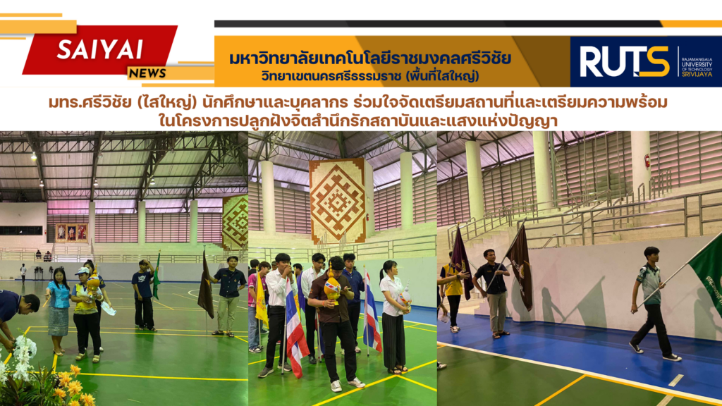 วันที่ 17 มกราคม 2568 นักศึกษา และบุคลากร มหาวิทยาลัยเทคโนโลยีราชมงคลศรีวิชัย วิทยาเขตนครศรีธรรมราช ร่วมจัดเตรียมสถานที่และเตรียมความพร้อมในโครงการปลูกฝังจิตสำนึกรักสถาบันและแสงแห่งปัญญา ซึ่งจัดขึ้นในวันเสาร์ที่ 18 มกราคม 2568 ณ อาคารเอนกประสงค์ไสใหญ่ 70 ปี ในโอกาสวันคล้ายวันสถาปนามหาวิทยาลัยเทคโนโลยีราชมงคล โดยได้รับเกียรติจากผู้ช่วยศาสตราจารย์ ดร.อวยพร วงศ์กูล รักษาราชการแทน ผู้อำนวยการสำนักงานวิทยาเขตนครศรีธรรมราช ดูแลความเรียบร้อยในการดำเนินโครงการ