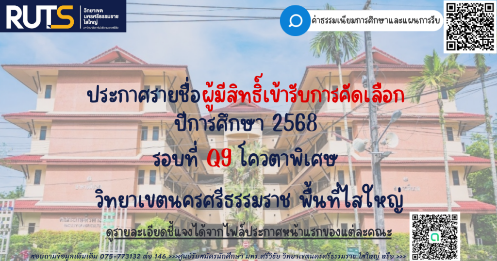 ประกาศรายชื่อ ผู้มีสิทธิ์เข้ารับการคัดเลือก ปีการศึกษา 2568 รอบที่ Q9 โควตาพิเศษ วิทยาเขตนครศรีธรรมราช พื้นที่ไสใหญ่เข้าสู่กระบวนการคัดเลือก โดยวิธีการสอบสัมภาษณ์แบบออนไลน์ ในวันที่ 24 มกราคม 2568 ให้นักศึกษาดูประกาศของคณะที่สมัคร ที่เอกสารแนบด้านล่าง อย่างละเอียด!