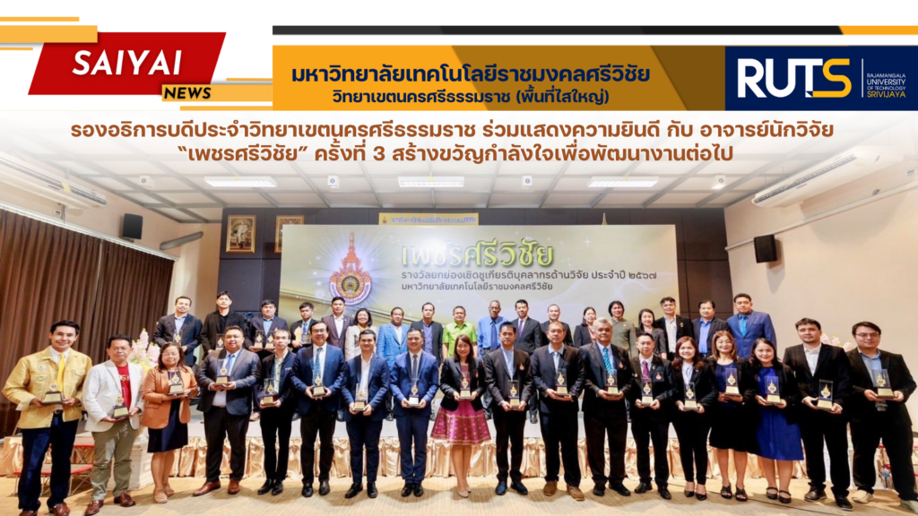 วันที่ 22 มกราคม 2568 ผู้ช่วยศาสตราจารย์ ดร.ขวัญหทัย ใจเปี่ยม รองอธิการบดีประจำวิทยาเขตนครศรีธรรมราช มหาวิทยาลัยเทคโนโลยีราชมงคลศรีวิชัย เข้าร่วมแสดงความยินดีกับอาจารย์นักวิจัย ภายใต้โครงการนิทรรศการผลงานวิจัย นวัตกรรม มทร.ศรีวิชัยและยกย่องเชิดชูเกียรตินักวิจัย ครั้งที่ 3 ประจำปี 2567โดยได้รับเกียรติจาก ศาสตราจารย์กิตติคุณ เปี่ยมศักดิ์ เมนะเศวต นายกสภามหาวิทยาลัยเทคโนโลยีราชมงคลศรีวิชัย เป็นประธานในการเปิดงาน พร้อมบรรยายพิเศษ ภายใต้หัวข้อ “มหาวิทยาลัยกับการขับเคลื่อนงานวิจัยสู่การใช้ประโยชน์เพื่อการพัฒนาที่ยั่งยืน” ตลอดจนมอบนโยบายเพื่อเป็นแนวทางในการดำเนินงานด้านงานวิจัย แก่คณะผู้บริหาร คณาจารย์ และนักวิจัยมี่เข้าร่วมงานจาก 12 คณะ 3 วิทยาลัย ณ ห้องประชุมศรีวิศวะ คณะวิศวกรรมศาสตร์ มหาวิทยาลัยเทคโนโลยีราชมงคลศรีวิชัย .