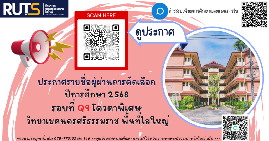 ประกาศรายชื่อผู้ผ่านการคัดเลือก ปีการศึกษา 2568 รอบที่ Q9 โควตาพิเศษ วิทยาเขตนครศรีธรรมราช พื้นที่ไสใหญ่ โดยผู้ผ่านการคัดเลือกดำเนินการตามขั้นตอน และดูประกาศได้จากลิงค์ดาวน์โหลดด้านล่าง