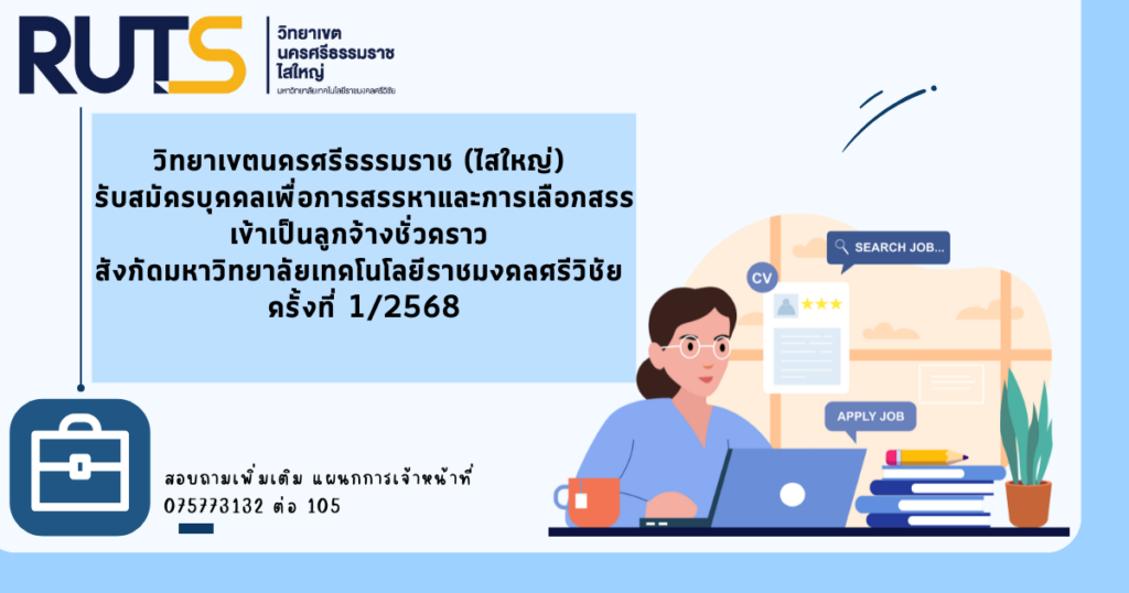 วิทยาเขตนครศรีธรรมราช (ไสใหญ่) รับสมัครบุคคลเพื่อการสรรหาและการเลือกสรรเข้าเป็นลูกจ้างชั่วคราว สังกัดมหาวิทยาลัยเทคโนโลยีราชมงคลศรีวิชัย ครั้งที่ 1/2568
