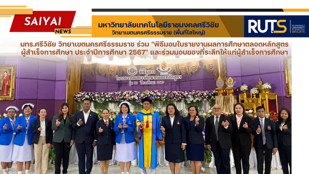 วันที่ 13 กุมภาพันธ์ 2568 ผู้ช่วยศาสตราจารย์ ดร. ขวัญหทัย ใจเปี่ยม รองอธิการบดีประจำวิทยาเขตนครศรีธรรมราช ร่วมเป็นเกียรติในกิจกรรม “พิธีมอบใบรายงานผลการศึกษาตลอดหลักสูตร ผู้สำเร็จการศึกษา ประจำปีการศึกษา 2567” และร่วมมอบของที่ระลึกให้แก่ผู้สำเร็จการศึกษา ณ หอประชุมเสาวรส วิทยาลัยพยาบาลบรมราชชนนี นครศรีธรรมราช