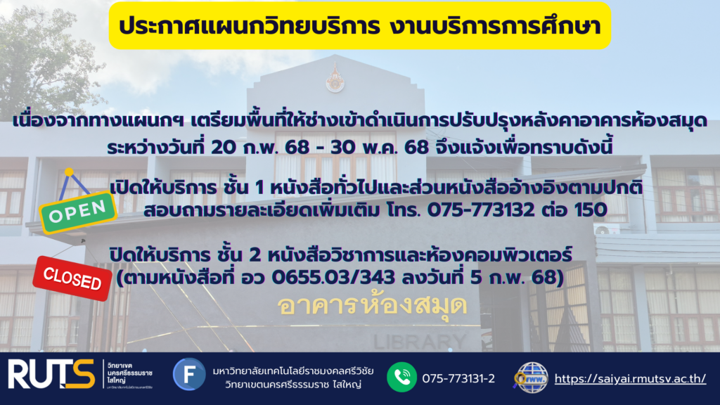 ปิดให้บริการ ชั้น 2 หนังสือวิชาการและห้องคอมพิวเตอร์ (ตามหนังสือที่ อว 0655.03/343 ลงวันที่ 5 ก.พ. 68
