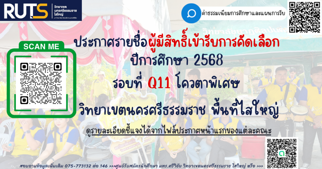 ประกาศรายชื่อ ผู้มีสิทธิ์เข้ารับการคัดเลือก ปีการศึกษา 2568 รอบที่ Q11 โควตาพิเศษ วิทยาเขตนครศรีธรรมราช พื้นที่ไสใหญ่ เข้าสู่กระบวนการคัดเลือก โดยวิธีการสอบสัมภาษณ์แบบออนไลน์ ในวันที่ 21 กุมภาพันธ์ 2568 ให้นักศึกษาดูประกาศของคณะที่สมัคร ที่เอกสารแนบด้านล่าง อย่างละเอียด!