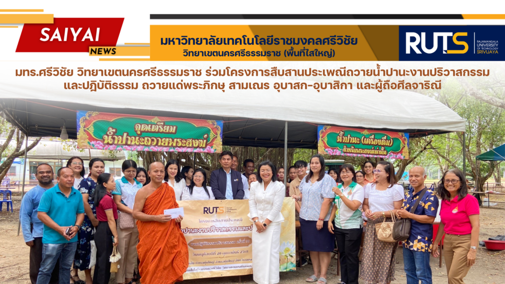 วันที่ 20 กุมภาพันธ์ 2568 ผู้ช่วยศาสตราจารย์ ดร.ขวัญหทัย ใจเปี่ยม รองอธิการบดีประจำวิทยาเขตนครศรีธรรมราช พร้อมด้วยอาจารย์สุภาพร ไชยรัตน์ ผู้ช่วยอธิการบดีประจำวิทยาเขตนครศรีธรรมราช ผู้ช่วยศาสตราจารย์ ว่าที่ ร.ต.ปรีชา มุณีศรี คณบดีคณะอุตสาหกรรมเกษตร ผู้ช่วยศาสตราจารย์ ดร.อวยพร วงศ์กูล รักษาราชการแทน ผู้อำนวยการสำนักงานวิทยาเขตนครศรีธรรมราช และบุคลากร เข้าร่วมโครงการสืบสานประเพณีถวายน้ำปานะงานปริวาสกรรมและปฎิบัติธรรม ถวายแด่พระภิกษุ สามเณร อุบาสก-อุบาสิกา และผู้ถือศีลจาริณ ณ วัดควนคลัง ตำบลทุ่งใหญ่ อำเภอทุ่งใหญ่ จังหวัดนครศรีธรรมราช