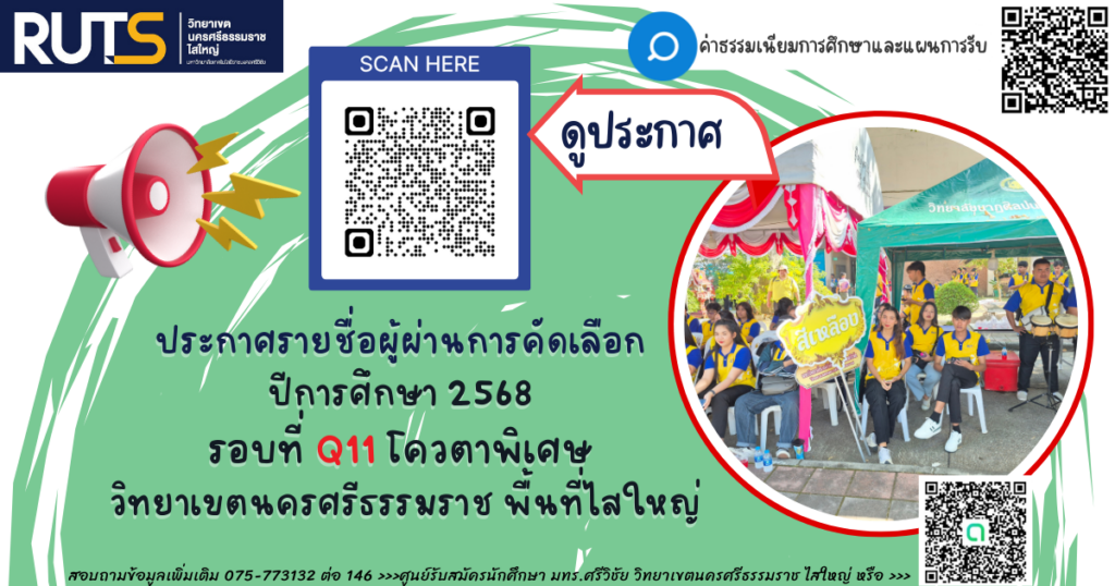 ประกาศรายชื่อผู้ผ่านการคัดเลือก ปีการศึกษา 2568 รอบที่ Q11 โควตาพิเศษ วิทยาเขตนครศรีธรรมราช พื้นที่ไสใหญ่ โดยผู้ผ่านการคัดเลือกดำเนินการตามขั้นตอน และดูประกาศได้จากลิงค์ดาวน์โหลดด้านล่าง