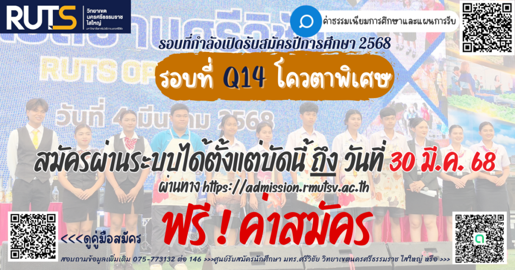 มหาวิทยาลัยเทคโนโลยีราชมงคลศรีวิชัย วิทยาเขตนครศรีธรรมราช พื้นที่ไสใหญ่ เปิดรับสมัครนักศึกษา ปีการศึกษา 2568
