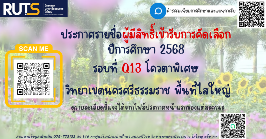 ประกาศรายชื่อ ผู้มีสิทธิ์เข้ารับการคัดเลือก ปีการศึกษา 2568 รอบที่ Q13 โควตาพิเศษ วิทยาเขตนครศรีธรรมราช พื้นที่ไสใหญ่ เข้าสู่กระบวนการคัดเลือก โดยวิธีการสอบสัมภาษณ์แบบออนไลน์ ในวันที่ 21 มีนาคม 2568 ให้นักศึกษาดูประกาศของคณะที่สมัคร ที่เอกสารแนบด้านล่าง อย่างละเอียด!