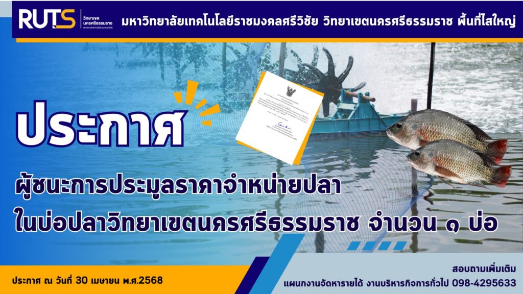 ประกาศ : ผู้ชนะการประมูลราคาจำหน่ายปลาในบ่อปลาวิทยาเขตนครศรีธรรมราช จำนวน 1 บ่อ