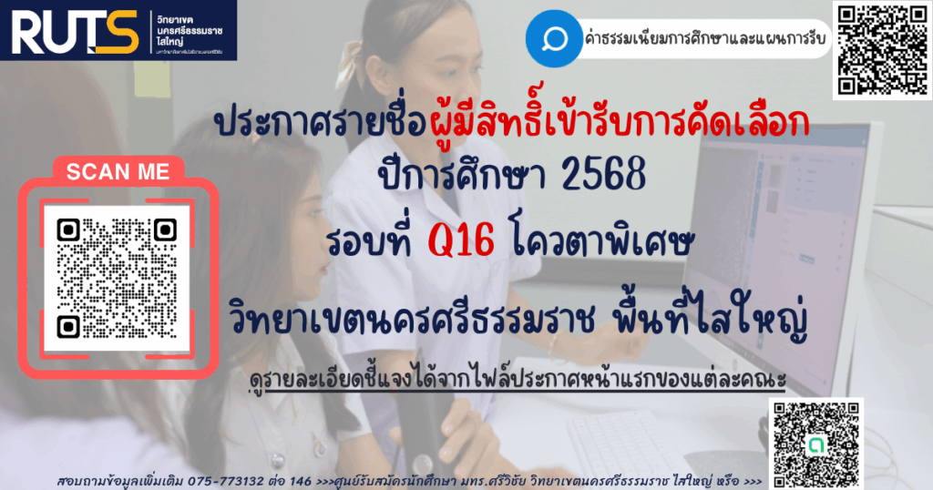 ประกาศรายชื่อ ผู้มีสิทธิ์เข้ารับการคัดเลือก ปีการศึกษา 2568 รอบที่ Q16 โควตาพิเศษ วิทยาเขตนครศรีธรรมราช พื้นที่ไสใหญ่ เข้าสู่กระบวนการคัดเลือก โดยวิธีการสอบสัมภาษณ์แบบออนไลน์ ในวันที่ 23 พฤษภาคม 2568 หรือ ให้นักศึกษาดูประกาศของคณะที่สมัคร ที่เอกสารแนบด้านล่าง อย่างละเอียด!