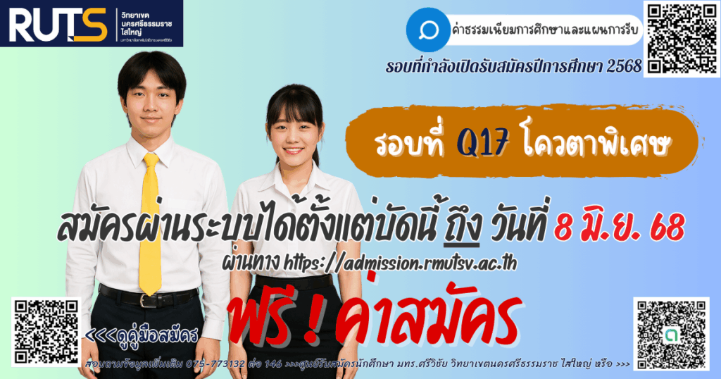 มหาวิทยาลัยเทคโนโลยีราชมงคลศรีวิชัย วิทยาเขตนครศรีธรรมราช พื้นที่ไสใหญ่ เปิดรับสมัครนักศึกษา ปีการศึกษา 2568