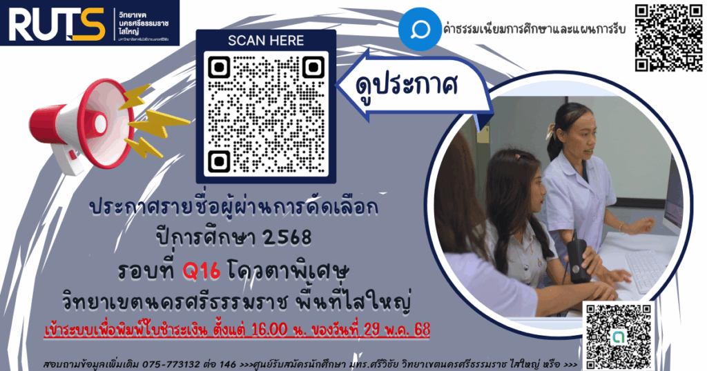 ประกาศรายชื่อผู้ผ่านการคัดเลือก ปีการศึกษา 2568 รอบที่ Q16 โควตาพิเศษ วิทยาเขตนครศรีธรรมราช พื้นที่ไสใหญ่